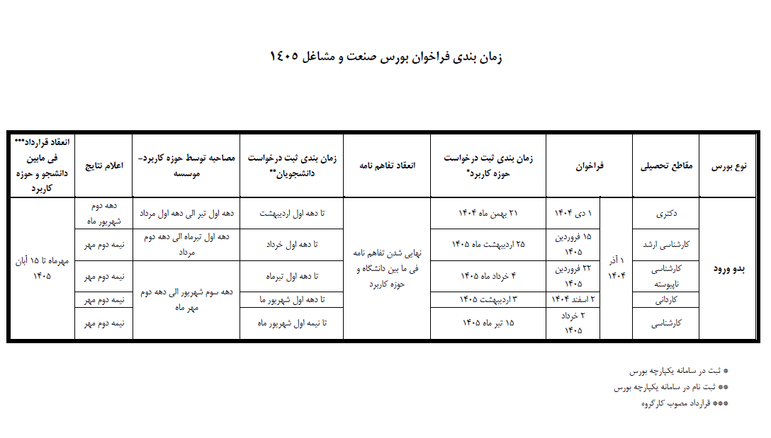 به گزارش دفتر ارتباط با صنعت دانشگاه و به نقل از اداره کل بورس و اعزام دانشجویان، دومین فراخوان رسمی بورس صنعت و مشاغل ویژه دانشجویان نوورود سال 1405 در مقاطع کارشناسی، کاردانی، کارشناسی ناپیوسته، کارشناسی ارشد و دکتری به صورت زیر اعلام می شود: