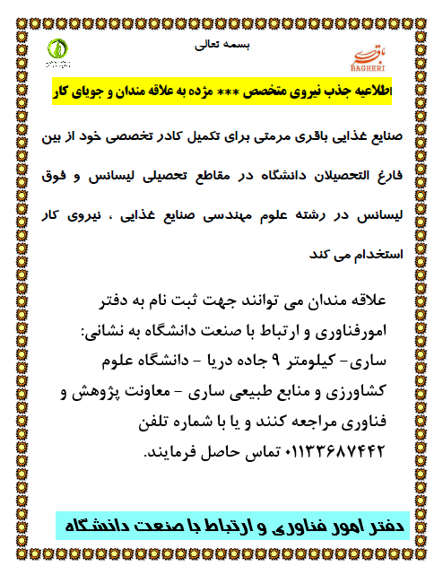صنایع غذایی باقری مرمتی برای تکمیل کادر تخصصی خود از بین فارغ التحصیلان دانشگاه در مقاطع تحصیلی لیسانس و فوق لیسانس در رشته علوم مهندسی صنایع غذایی، نیروی کار استخدام میکند.